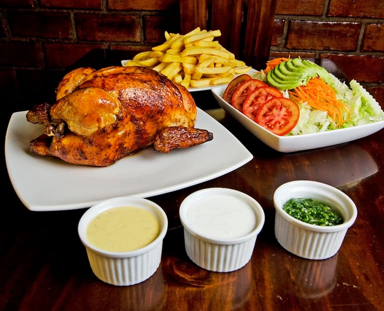 1/4 de Pollo a la Brasa + Arroz Chaufa + 1/2 Chorizo + Plátano Frito + Huevo Frito + Papas Fritas + Ensalada + Cremas.